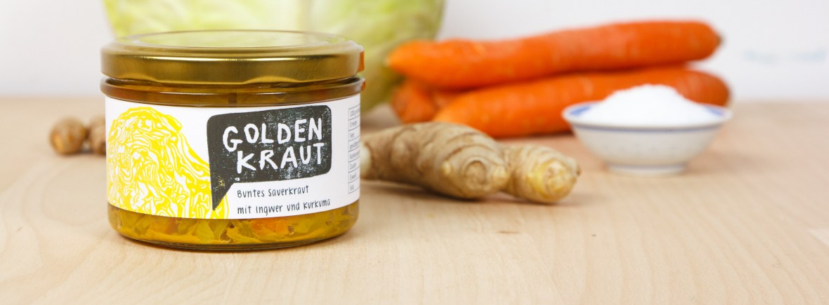 Unser Goldenkraut ist ein mildes, goldgelbes Sauerkraut mit Ingwer und Kurkuma. Neben Weißkohl haben wir hier noch fein geraspelte Möhren mit fermentiert, die dem Kraut eine leichte Süße und knackige Stückchen verleihen. Dass Kurkuma ziemlich gesund ist, haben sicher viele von euch schon gehört – toll, dass er in fermentierter Form noch besser aufnehmbar sein soll!